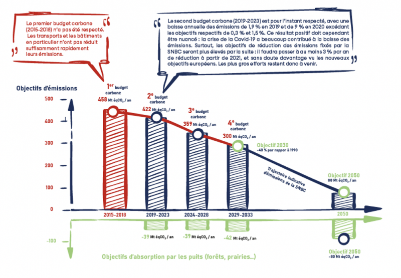 Pour réduire ses émissions, la France s’est dotée d’une feuille de route : la stratégie nationale bas-carbone (SNBC). Elle fixe des objectifs et des budgets carbone pour chaque secteur.
