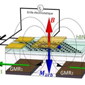 Le dispositif de mesure comprend une paire de capteurs à magnétorésistance géante (GMR) fabriqués au Service de physique de l’état condensé (SPEC, CEA/CNRS) qui ont la caractéristique d’être très sensibles au champ magnétique généré par les boucles de courant orbital induites dans le graphène, tout en étant insensibles au champ magnétique perpendiculaire au plan de graphène qui génère ces boucles (figure). Une tension électrostatique est appliquée à une électrode, la grille, placée au-dessus de l’échantillon. La grande sensibilité de la réponse magnétique du graphène à la tension de grille a été mise à profit en modulant celle-ci périodiquement en fonction du temps, et ainsi, grâce à la détection synchrone du signal GMR, une discrimination optimale du signal magnétique recherché par rapport aux bruits parasites de l’expérience a été réalisée : la précision obtenue est meilleure que le millionième du champ magnétique terrestre. En balayant le potentiel chimique autour du point de Dirac grâce à la tension de grille, un pic diamagnétique est alors détecté au point de Dirac, en accord avec la théorie. Lorsque le champ magnétique augmente, sa largeur augmente et des oscillations périodiques apparaissent de part et d’autre du point de Dirac, connues sous le nom d’oscillations de Haas-van Alphen, et qui sont les signatures des autres niveaux d’énergie de Landau.