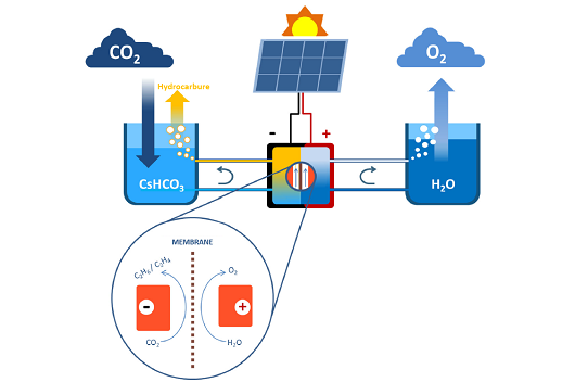 Martin Foldyna : Notre machine comprend deux parties : un module photovoltaïque et un module électrochimique. En laboratoire, nous illuminons le module photovoltaïque par un éclairage semblable à la lumière solaire. Cette lumière est convertie en électricité, qui alimente en tension et en courant le module électrochimique, lequel est plongé dans de l’eau enrichie en CO2. Ce module est composé de deux électrodes en oxyde de cuivre, un matériau qui agit comme catalyseur pour les réactions chimiques. Ces réactions décomposent l’eau en oxygène et hydrogène. Mais elles produisent également des composants à base de carbone, comme l’éthane et l’éthylène. Résumé ainsi, cela semble facile. Cependant, la chimie en jeu n’est pas triviale. De plus, même si produire ainsi de l’hydrogène est relativement facile, le rendement global que nous avons obtenu pour les hydrocarbures atteint 2,3 %, ce qui est déjà un très bon résultat.