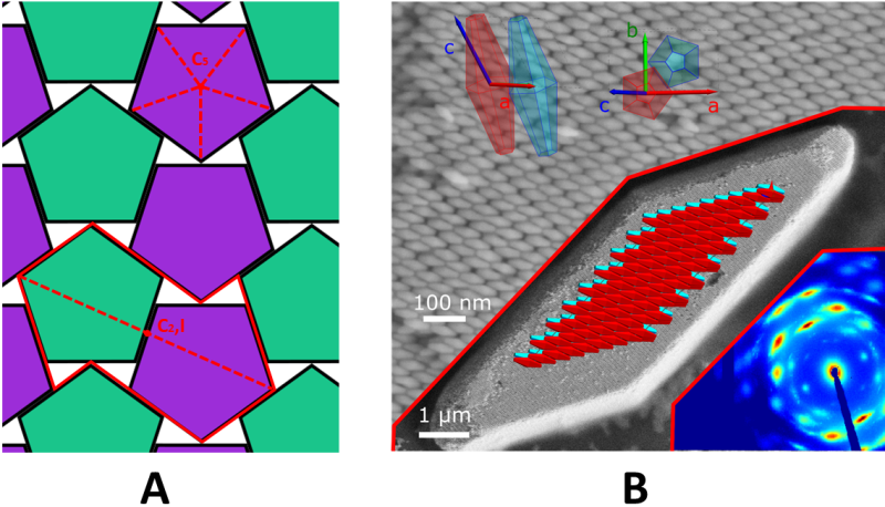 Cette perte de symétrie peut être comprise à travers une analogie avec l’empilement optimum des pentagones réguliers dans le plan : les objets individuels ont une symétrie de rotation d’ordre 5, mais ils s’associent par deux ce qui crée un centre d’inversion et ce faisant réduit leur symétrie de rotation à l’ordre 2 (figure). Dans les cristaux obtenus expérimentalement, les bipyramides de section pentagonale s’associent de manière tout à fait similaire, avec deux particules par maille, généralisant à trois dimensions le mode d’empilement des pentagones réguliers (figure). L’assemblage a été « disséqué » par un faisceau d’ions afin d’en imager chaque tranche et de reconstituer la structure tridimensionnelle. En combinant cette information avec la diffusion des rayons X, la symétrie du réseau a été identifiée comme étant triclinique. De plus, des simulations numériques reproduisant la symétrie et la densité de l’empilement ont confirmé qu’il s’agit bien de la solution la plus compacte possible.