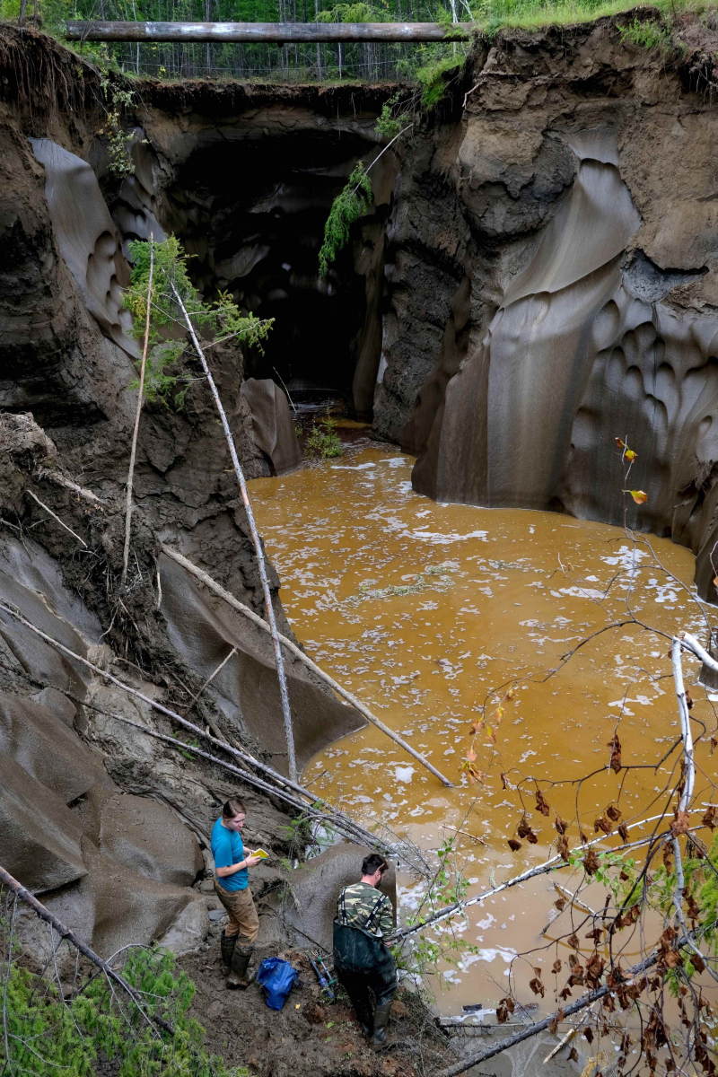 Dans cette région, les lacs de thermokarst3 se forment par le dégel du sol. Ils affectent les couches plus profondes et riches en glace. Les terrains thermokarstiques peuvent être affectés par des affaissements, la formation de cavités, une forte érosion, etc., à l’image des terrains karstiques4 plus communs dans les zones tropicales ou tempérées. Ils offrent un terrain d’expérimentation idéal. Le permafrost y est en effet parmi les plus épais et les plus riches en glace de la planète et c’est aussi l’un des plus anciens. En effet, lors de la dernière période glaciaire, culminant il y a environ 20 000 ans, contrairement au grand nord canadien, cette région de Sibérie n’était pas sous la calotte glaciaire et le pergélisol affleurait déjà.