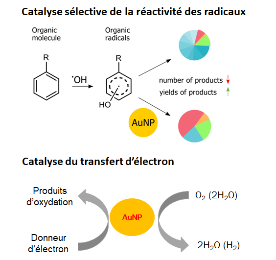 En effet, les scientifiques du Laboratoire de chimie physique (CNRS/Université Paris-Saclay) montrent que ces nanoparticules brutes, non fonctionnalisées, ne sont pas chimiquement neutres et se révèlent même d’excellents catalyseurs pouvant modifier les schémas réactionnels habituels.  Prenons le cas de la réaction d’hydroxylation de l'acétanilide en présence d’O2. L’acétanilide est en effet le précurseur de nombreuses molécules organiques comme la pénicilline, le paracétamol ou le camphre, et son hydroxylation est étudiée comme modèle de monooxygénase du cytochrome P-450. Les scientifiques constatent que l’ajout de nanoparticules d’or provoque une diminution d’un facteur 40 de la formation du produit de réaction. Observation inattendue car, en l'absence de nanoparticules d'or, l'oxygène est connu pour favoriser les réactions d'hydroxylation. Par contre, l’oxydation de la vitamine C, qui est un donneur d'électrons, est accélérée plus de 1000 fois en présence d'AuNPs. Plus généralement, les NP d'or en présence d'O2 favorisent l’oxydation des espèces donneuses d'électrons comme les radicaux ou certaines molécules présentes dans le milieu biologique.