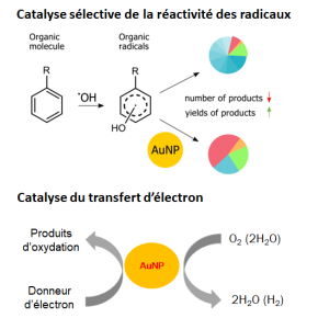 On peut par conséquent s'attendre à ce que les AuNPs puissent également altérer le métabolisme cellulaire en oxydant les radicaux organiques naturellement produits dans la cellule ou en oxydant les molécules donneuses d’électrons présentes dans son environnement. Cette activité catalytique jusqu’à maintenant ignorée lors de l’introduction des AuNPs dans les milieux biologiques devra maintenant être prise en compte pour comprendre les mécanismes réactionnels mis en jeu et, pourquoi pas, rendre intelligibles de nombreux résultats expérimentaux restés jusqu'à présent inexpliqués.