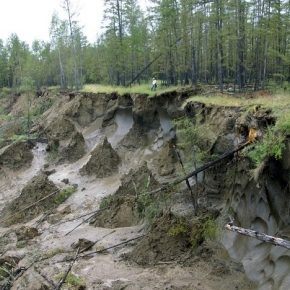 Ils ont ainsi montré que la concentration en glace du pergélisol est un facteur important dans la genèse de ces effondrements. Les scientifiques ont observé que les sols gelés très hétérogènes, avec des coins de glace verticaux2 , subissent une forte déformation pendant la phase de dégel. Durant cette période, la circulation de l'air chaud est facilitée, accentuant les effondrements de terrain. Cette érosion pendant la phase de réchauffement, parallèlement à un apport d'eau excédentaire, accélère la fonte et engendre un affaissement à la base de la couche de glace. La dégradation accélérée de ces sols riches en glace modifie la chimie des eaux de surface et provoque à son tour la libération de gaz à effet de serre avec des phénomènes de rétroactions particulièrement puissants.