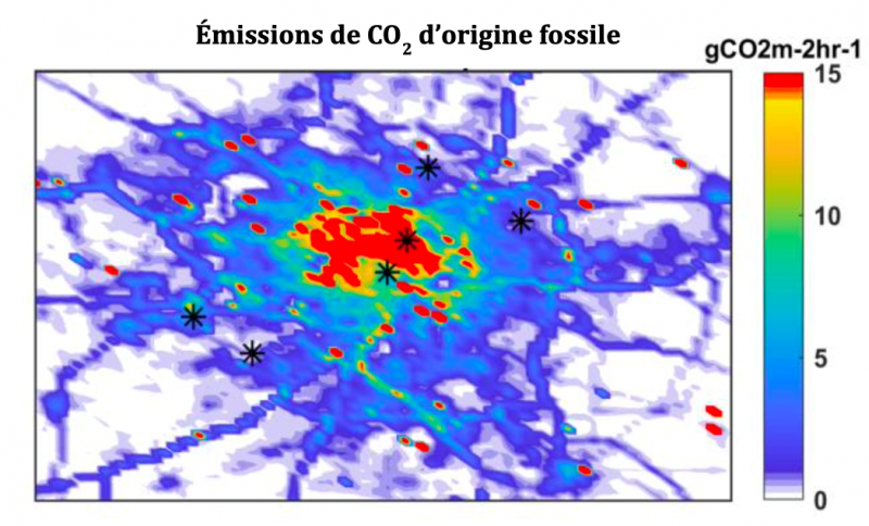 À Paris, nous nous appuyons sur deux réseaux de capteurs existants. Le premier est celui du LSCE qui comprend six tours équipées de capteurs mesurant le dioxyde de carbone (CO2), le monoxyde de carbone (CO) et le méthane (CH4), placés à des hauteurs allant de 20 à 80 mètres. Deux des tours sont dans Paris et les quatre autres en banlieue. Le deuxième réseau est celui d’AirParif, l’observatoire de la qualité de l’air en Île-de-France, qui mesure essentiellement les oxydes d’azote (NOx)1 , les particules fines (PM) et les composés organiques volatils (COV) grâce à une quarantaine de capteurs. Nous n’avons recours qu’à la dizaine de capteurs situés à 20-30 mètres de hauteur afin d’avoir une cohérence dans les données des deux réseaux. Comme chaque composé est émis par certains secteurs plus que d’autres, par exemple le trafic routier émet un certain niveau de CO et de NOx alors que le chauffage au bois émet beaucoup de NOx mais pas de CO, il est possible de différencier les secteurs dans les mesures. La saisonnalité (absence de chauffage en été) et les cycles diurnes (pics de trafic aux heures de pointe) nous permettent également de mieux cerner quels secteurs contribuent aux observations. En parallèle, nous étudions les modèles météorologiques qui nous indiquent d’où proviennent les masses d’air qui arrivent sur Paris. Une fois que nous savons d’où elles viennent, les mesures réalisées en dehors de l’agglomération par les tours du LSCE permettent de soustraire les GES amenés par le vent, et donc non-émis par la ville, au bilan total. Grâce à cette approche, nous obtenons des bilans mensuels relativement fiables. Pour être plus précis, il nous faudrait davantage de capteurs et mieux comprendre comment sont transportés certains GES dans la ville.