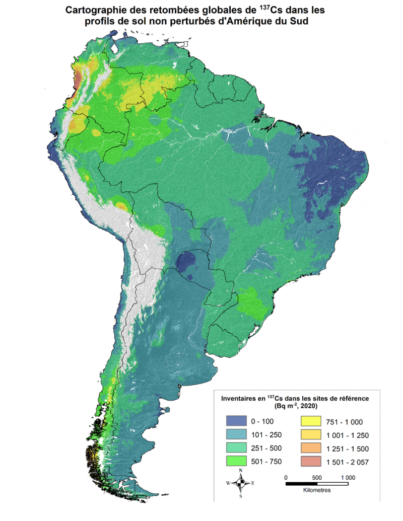 Une étude menée par le Laboratoire des Sciences du Climat et de l'Environnement - LSCE (CNRS/CEA/UVSQ), en collaboration avec ses partenaires de l’INRAE et plusieurs universités du Brésil et d’Uruguay, a synthétisé les informations disponibles dans la littérature. Les résultats confirment que la distribution spatiale des retombées du 137Cs est très dépendante de la latitude, avec un maximum entre 30 et 50° Sud. Les niveaux de retombées ainsi estimés sont supérieurs à ceux dévoilés par de précédentes estimations1 . Une analyse statistique a été utilisée pour créer une carte de référence des retombées de 137Cs dans les sols du continent. Le potentiel d'application de la technique des inventaires de 137Cs est examiné à la lumière de cette analyse bibliographique exhaustive. Les zones à échantillonner en priorité à l’avenir pour améliorer cette première carte ont également été mises en évidence (contreforts des Andes, Colombie, Pérou…). Cette carte de référence pourrait également avoir de nombreuses autres applications en sciences de la Terre (pédologie, climatologie...).