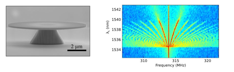 Dans une salle blanche, les chercheurs ont fabriqué des disques miniatures en arséniure de gallium (AsGa), un matériau semiconducteur de haute pureté. A l’aide d’une fibre optique effilée, ils ont injecté de façon très concentrée de la lumière laser au sein des disques, en résonance avec leurs modes optiques, et ont ensuite observé leur comportement mécanique. En raison de cette forte concentration, une partie de l’énergie optique est transformée non seulement en énergie mécanique, mais aussi en énergie électrique et en chaleur. Au-delà d’un seuil d'intensité lumineuse, les chercheurs ont observé un mouvement mécanique impulsionnel centré à une fréquence de 314 MHz et caractérisé par une décomposition spectrale en fréquences régulière sur un domaine étendu, constituant ainsi un peigne mécanique. A l’aide d’un modèle décrivant le couplage entre les quatre formes d’énergie, ils ont reproduit l’évolution du peigne en fonction des conditions optiques et montré que les caractéristiques du peigne sont contrôlées par la longueur d’onde et la puissance du laser (voir figure). La prochaine étape est d'analyser les mécanismes à l'origine du bruit dans ces microrésonateurs afin d'envisager l'utilisation de ce type de peigne pour améliorer les capteurs de force.
