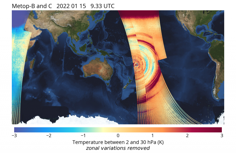 Cathy Clerbaux, chercheuse au CNRS et basée à Sorbonne Université (LATMOS) et son étudiante Marie Bouillon, font partie des auteurs qui ont fourni des données pour analyser l’impact de cette éruption majeure sur l’atmosphère : " C’est la première fois que nous avons mesuré de telles perturbations atmosphériques avec notre sondeur IASI à bord des satellites Metop. D’énormes quantités d'eau de mer ont été vaporisées pendant l'éruption et ont directement atteint la stratosphère. Les ondes consécutives à l’éruption sont clairement visibles sur les images satellites et impactent significativement et visiblement les températures atmosphériques, jusqu’à une altitude d’environ 50 km ».