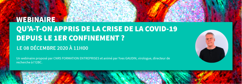 CNRS Formation Entreprises met en place un nouveau webinaire « Qu'a-t-on appris de la crise de la Covid-19 depuis le premier confinement ? » qui sera animé par Yves Gaudin, virologue, directeur de recherche CNRS à l'Institut de biologie intégrative de la cellule - I2BC (CNRS/CEA/UPSaclay), le mardi 08 décembre 2020 à 11h00.